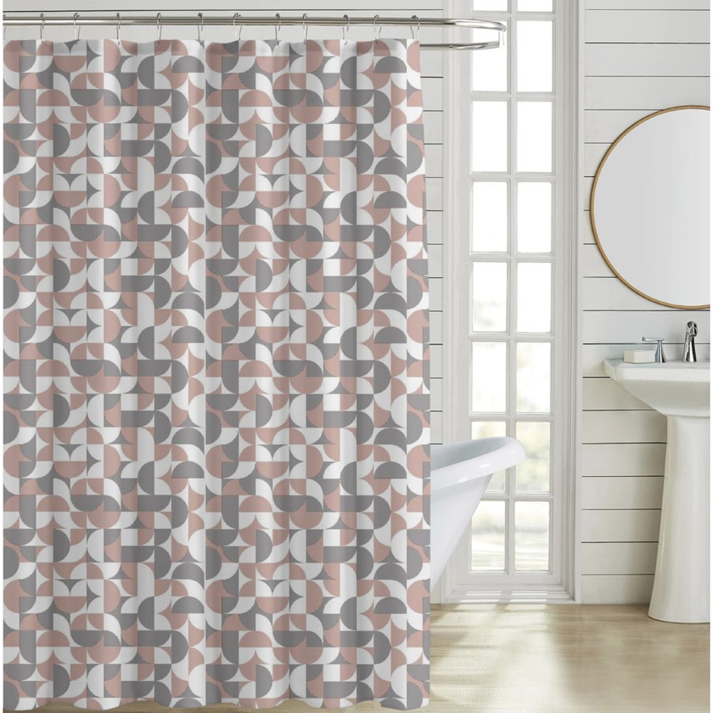 - Κουρτίνα πολυεστερική 90gsm, αδιάβροχη, με γεωμετρικό μοτίβο σε γκρι, άσπρο και ροζ χρώμα.