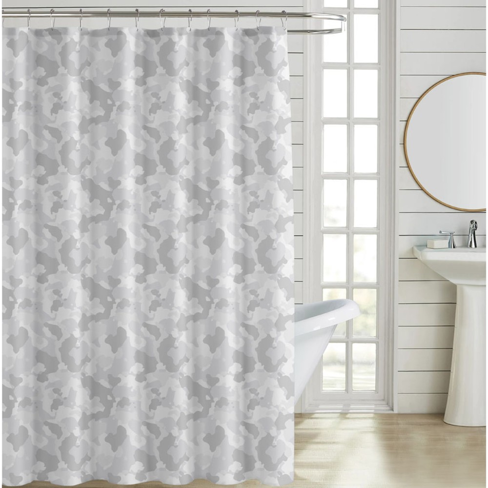 - Κουρτίνα πολυεστερική 90gsm, αδιάβροχη, με λευκή βάση και σχέδιο αφηρημένο μοτίβο σε γκρι αποχρώσεις