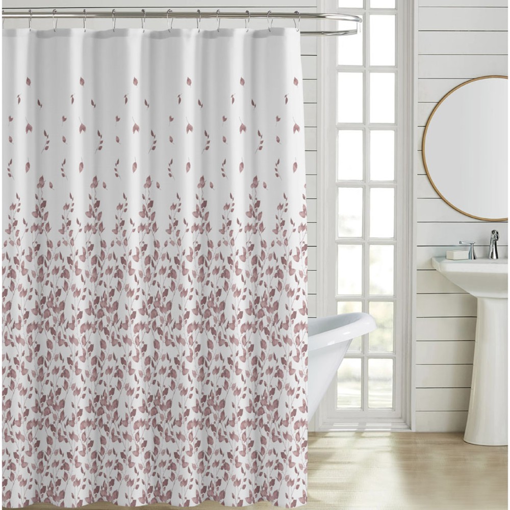 - Κουρτίνα πολυεστερική 90gsm, αδιάβροχη, σε λευκή βάση με διακριτικό μοτίβο από φύλλα σε απόχρωση σάπιου μήλου