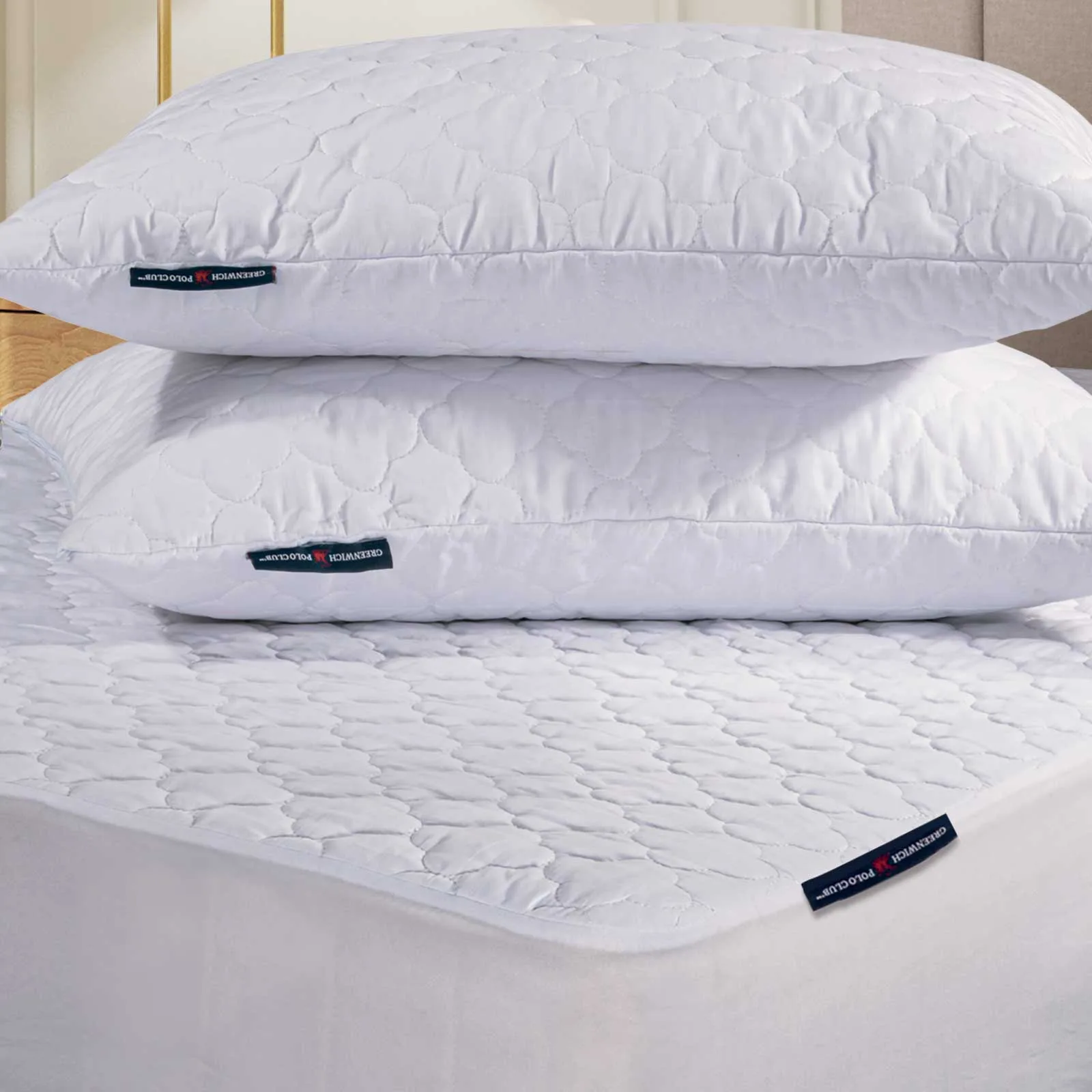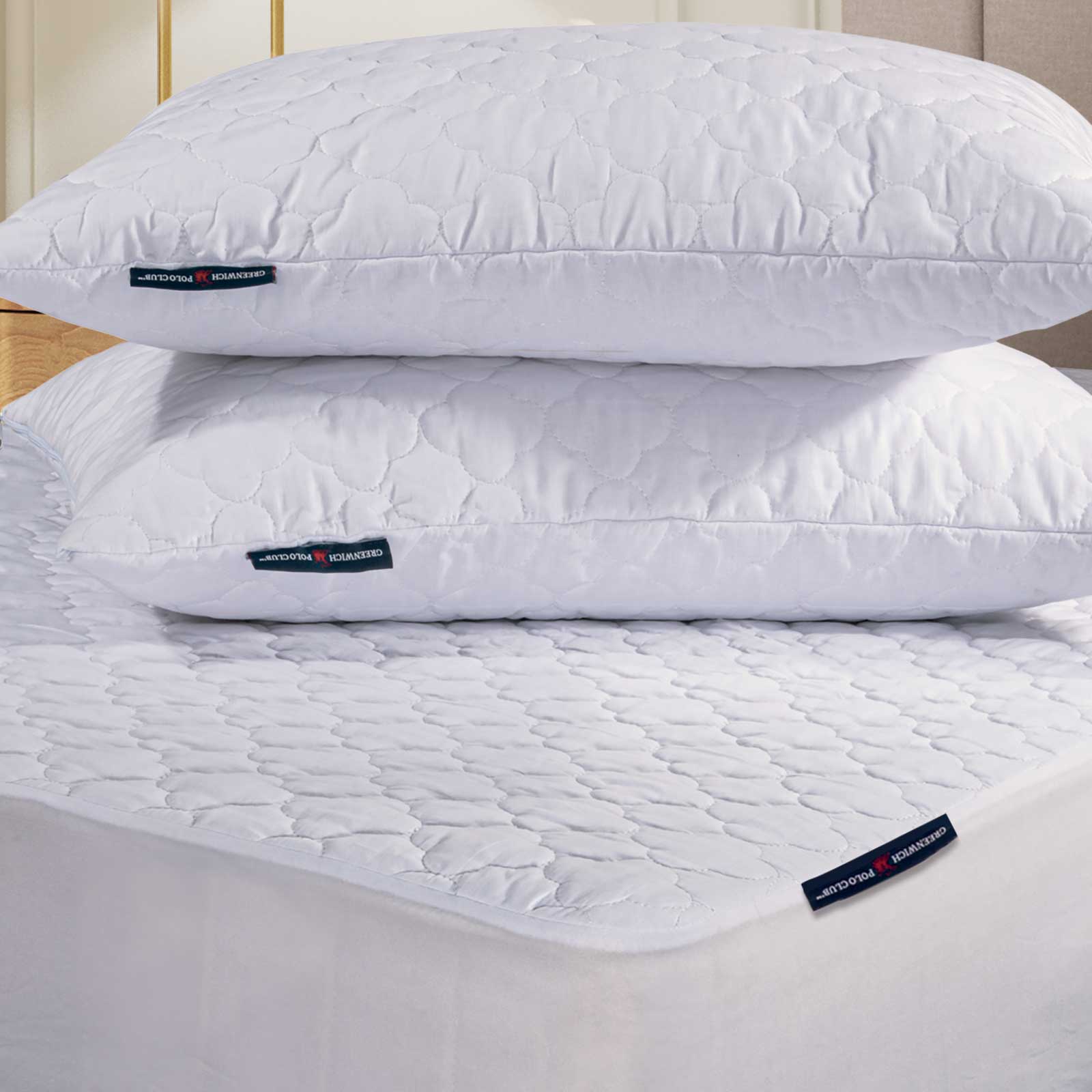 Προστατέψτε το μαξιλάρι σας από ανεπιθύμητους λεκέδες και σκόνη χρησιμοποιώντας καπιτονέ βαμβακερά καλύμματα, προκειμένου να επιτρέπεται η φυσική αναπνοή του σώματος.Το εσωτερικό τους από υψηλής ποιότητας Hollowfiber, ενώ είναι από non-woven για άνεση και προστασία. Το σετ περιλαμάνει ένα ζεύγος μαξιλαροθήκες 50x70cm. Σύνθεση: 100% Βαμβάκι. Επίστρωση: πολυεστερική βάτα. Kάτω μέρος: non-woven