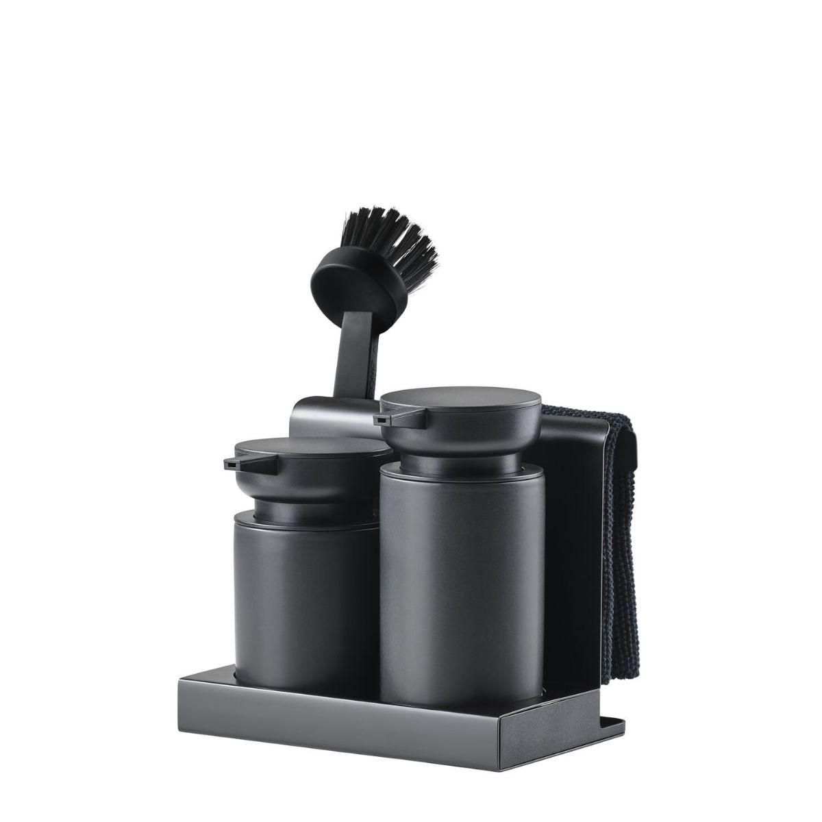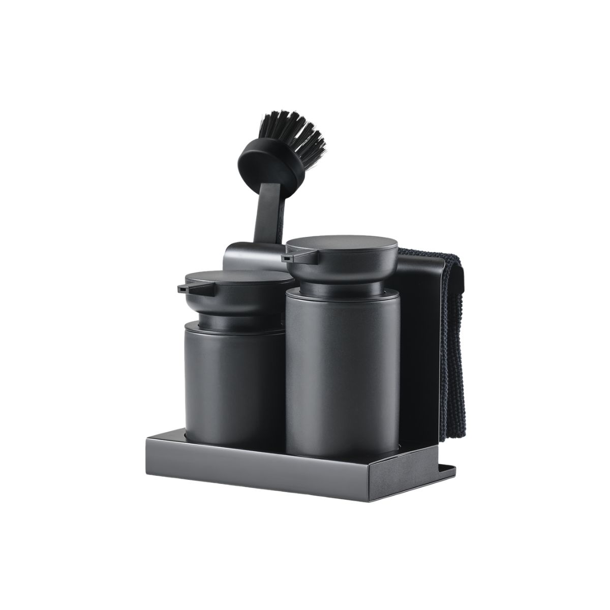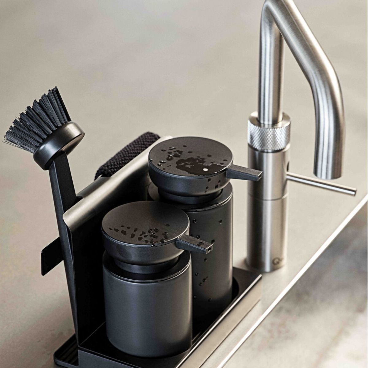 Στο μπροστινό μέρος διαθέτει δύο dispenser, ιδανικά για υγρό πιάτων και κρεμοσάπουνο χεριών ή αντισηπτικό, κατασκευασμένα από stoneware. Στο πίσω μέρος υπάρχει θέση για το dishcloth, ώστε να στεγνώνει διακριτικά, ενώ το βουρτσάκι καθαρισμού παραμένει πάντα εύκολα προσβάσιμο. Η πρακτική βάση συλλέγει τα υπολείμματα νερού, βοηθώντας να διατηρείται ο πάγκος πιο καθαρός και τακτοποιημένος.