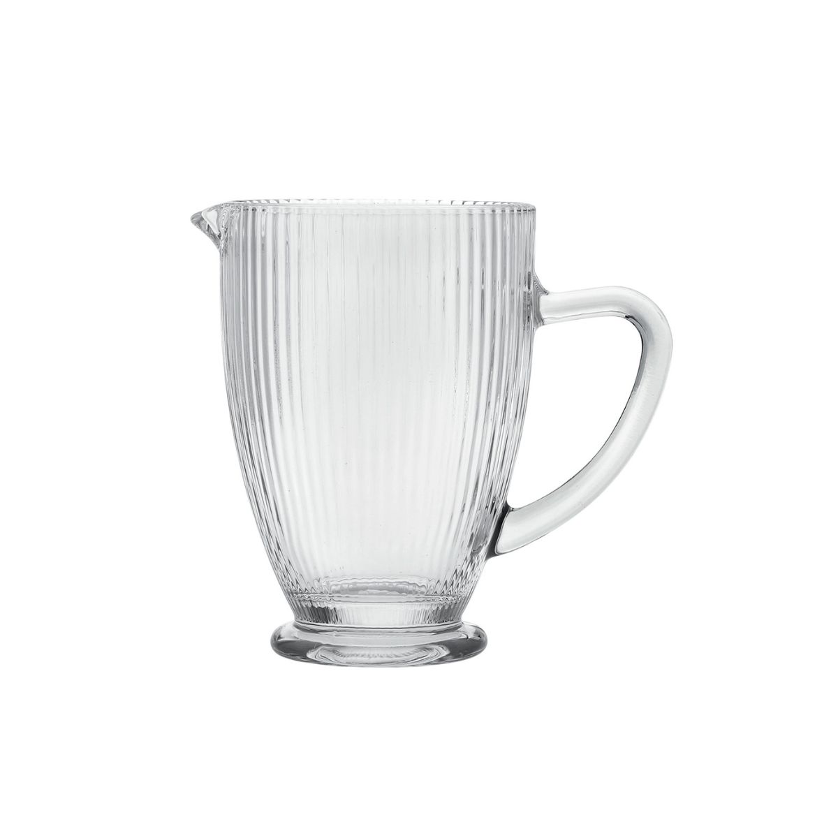 Κατασκευασμένη από διάφανο γυαλί, διαθέτει το χαρακτηριστικό ανάγλυφο κάθετο σχέδιο της συλλογής, που χαρίζει λάμψη και vintage αισθητική στο σερβίρισμα. Η πρακτική λαβή και το στόμιο εκροής διευκολύνουν τη χρήση, ενώ η χωρητικότητα 1,3 Lt την κάνει ιδανική για νερό, χυμούς, αναψυκτικά, παγωμένο τσάι ή σπιτικές λεμονάδες.