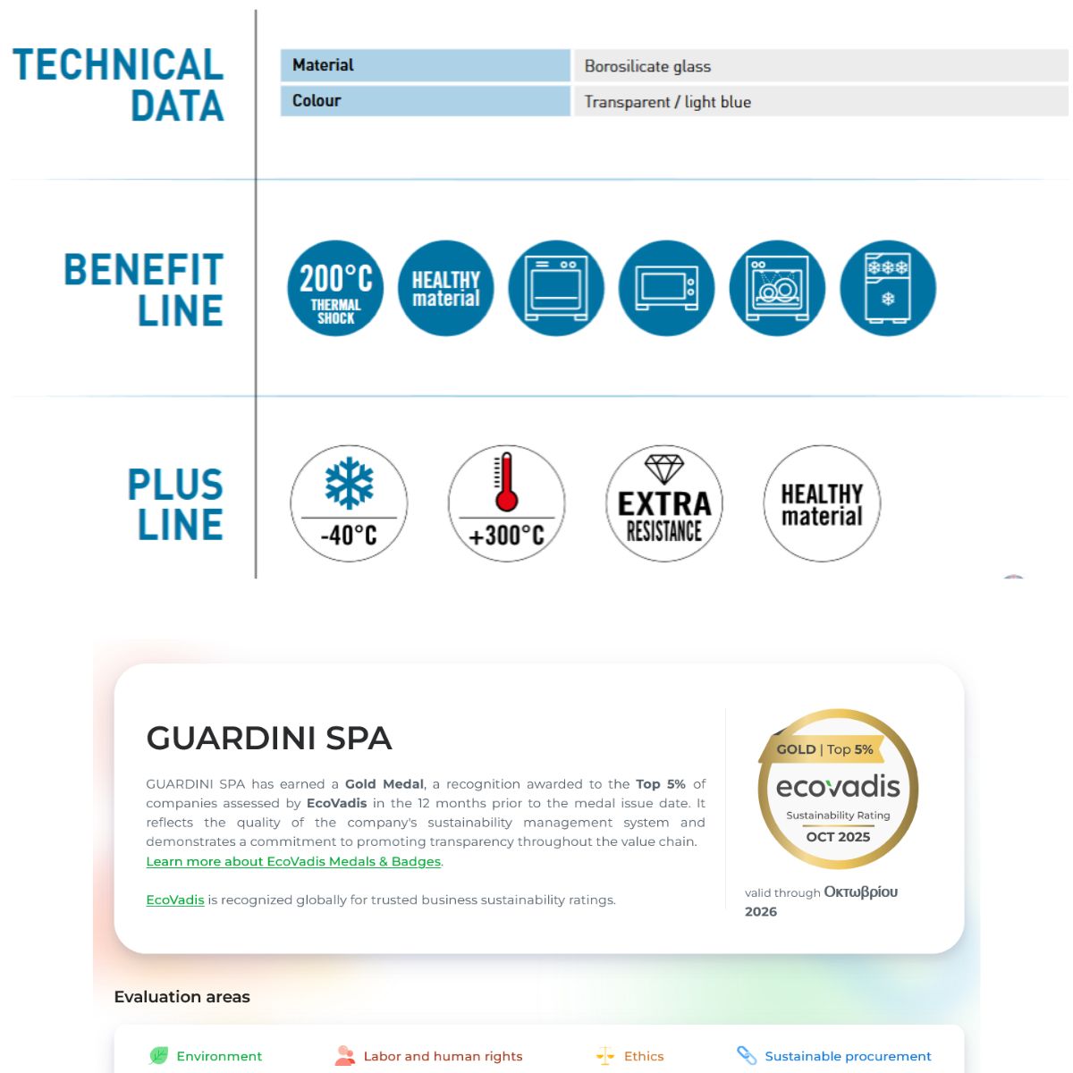 Το βοριοπυριτικό γυαλί Guardini είναι υγιεινό υλικό, χωρίς BPA, που δεν συγκρατεί οσμές και λεκέδες, ενώ παράλληλα προσφέρει αυξημένη αντοχή σε γρατζουνιές και φθορά. Αντέχει σε θερμοκρασίες από -40°C έως +300°C και σε θερμικό σοκ έως 200°C, ώστε να καλύπτει με ασφάλεια πολλές διαφορετικές ανάγκες στην κουζίνα.