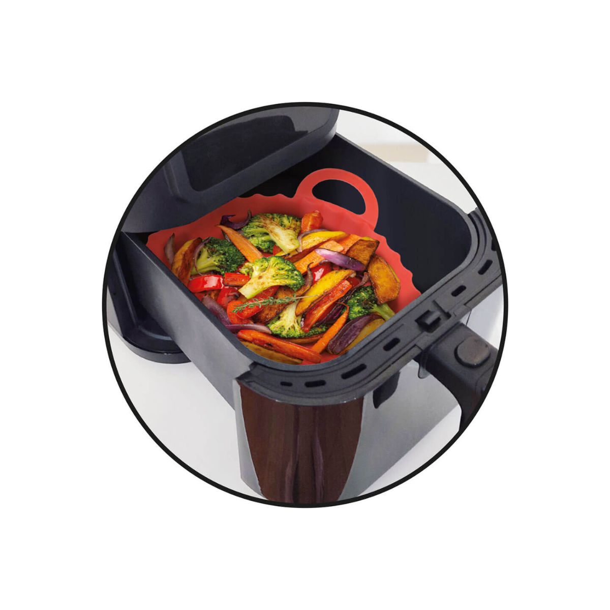 Η σιλικόνη είναι εύκαμπτη και χάρη στην αντικολλητική επιφάνειά της βοηθά στο ψήσιμο χωρίς πρόσθετα λιπαρά, ενώ παράλληλα καθαρίζεται εύκολα μετά τη χρήση. Η σειρά αξεσουάρ air fryer της Guardini είναι σχεδιασμένη ώστε να προστατεύει το καλάθι της συσκευής από υπολείμματα φαγητού και να είναι συμβατή με όλες τις μάρκες air fryer. Η μέγιστη θερμοκρασία χρήσης για τα σκεύη σιλικόνης είναι 230°C.
