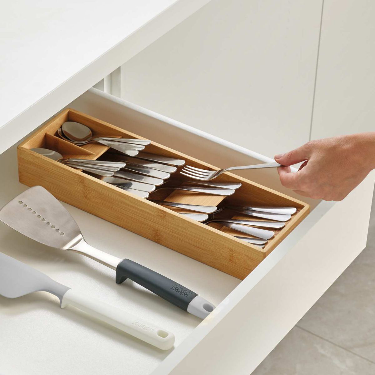 Η θήκη DrawerStore™ Bamboo της Joseph Joseph αποτελεί μια επαναστατική λύση οργάνωσης. Χάρη στον μοναδικό σχεδιασμό των επικαλυπτόμενων θηκών, σας επιτρέπει να αποθηκεύσετε ένα πλήρες σετ μαχαιροπίρουνων καταλαμβάνοντας λιγότερο από τον μισό χώρο σε σχέση με τις συμβατικές θήκες.