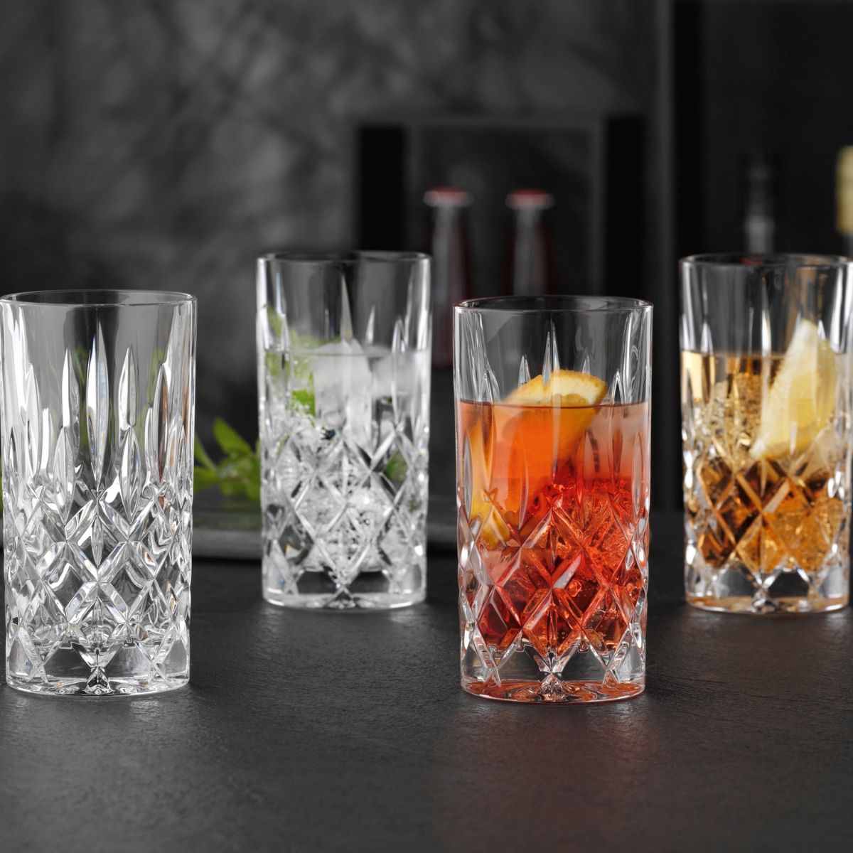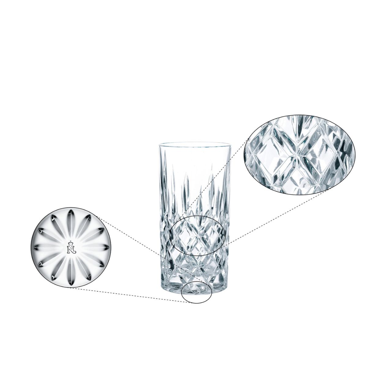 Η συλλογή Noblesse ξεχωρίζει για το κλασικό ανάγλυφο σχέδιο με εφέ κοπής διαμαντιού, που χαρίζει στο ποτήρι πολυτελή εμφάνιση και εντυπωσιακή λάμψη. Το ψηλό σχήμα τους τα κάνει ιδιαίτερα πρακτικά για ποτά με πάγο, mixers, gin tonic, whisky soda, spritz και κάθε δροσερό cocktail που θέλεις να αναδειχθεί σωστά στο σερβίρισμα.