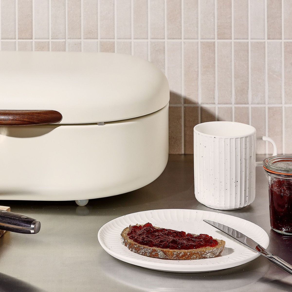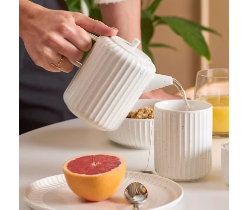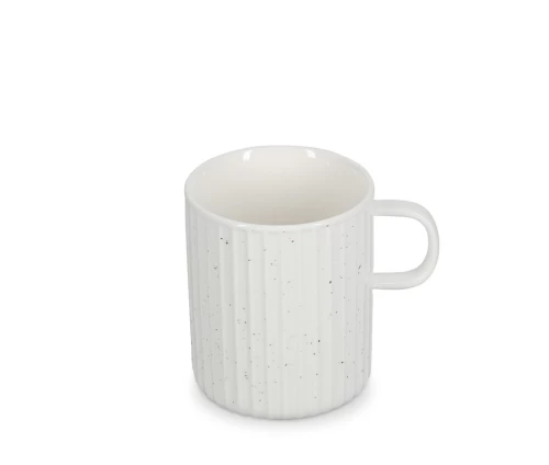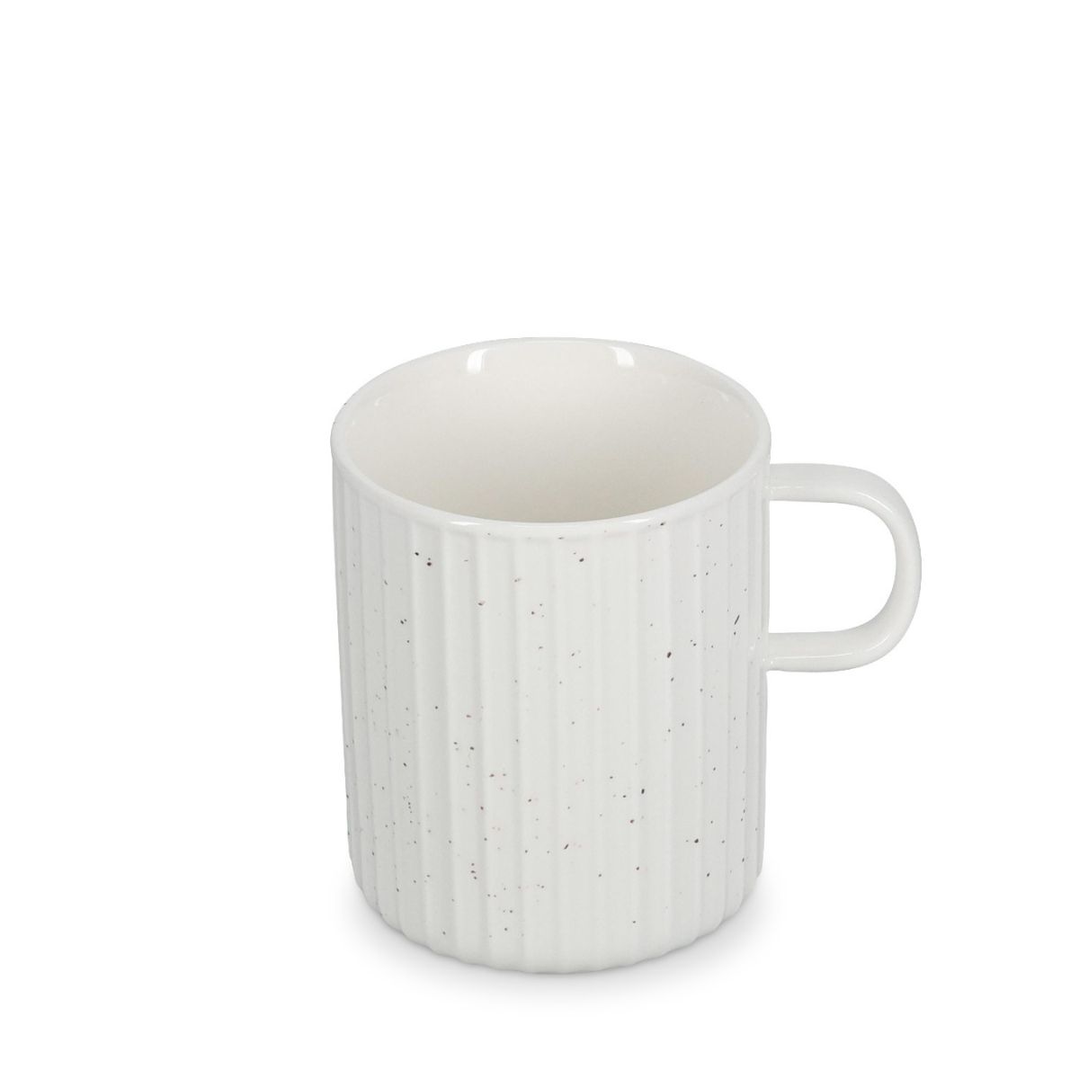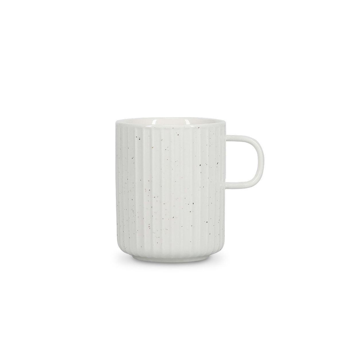 Η κούπα Ora Gloss (κωδικός: 840047) ξεχωρίζει για την οργανική της κομψότητα. Η επιφάνειά της χαρακτηρίζεται από κάθετες ανάγλυφες ραβδώσεις που προσφέρουν μια υπέροχη αίσθηση στην αφή, ενώ το γυαλιστερό λευκό φινίρισμα με τα διακριτικά σκούρα στίγματα (speckled effect) δίνει έναν χειροποίητο, "artisan" χαρακτήρα σε κάθε κομμάτι.