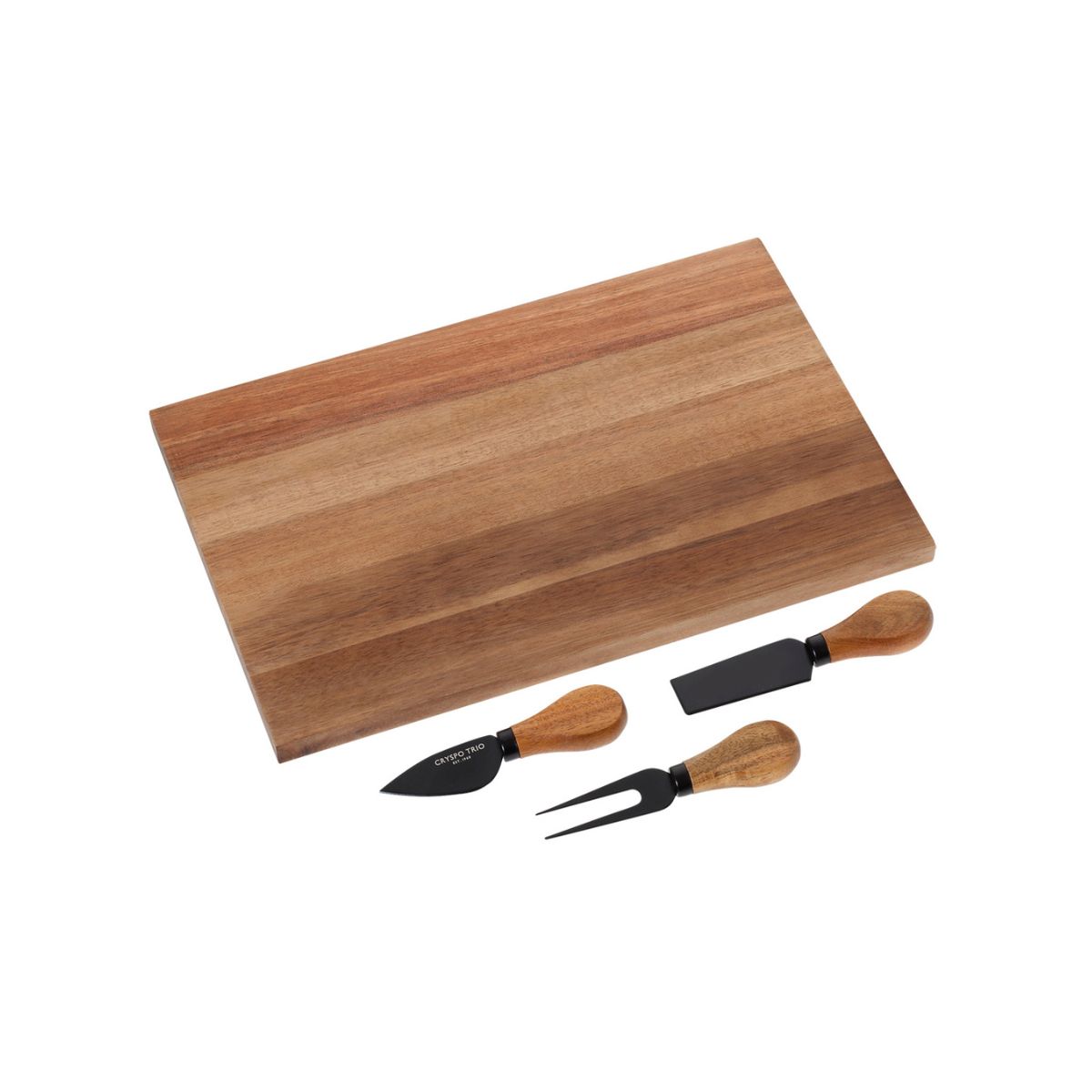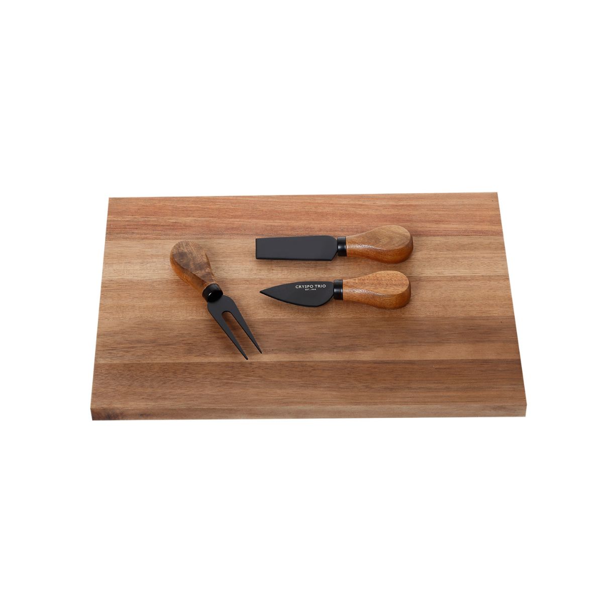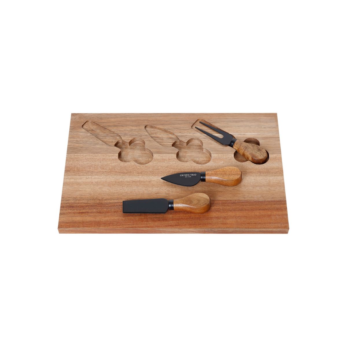 Το σετ σερβιρίσματος της Cryspo Trio (κωδικός 01.00.423) συνδυάζει την υψηλή αισθητική με την απόλυτη εργονομία. Το ιδιαίτερο χαρακτηριστικό αυτού του σετ είναι οι ειδικά διαμορφωμένες υποδοχές στην επιφάνεια του ξύλου, που επιτρέπουν στα εργαλεία να φωλιάζουν με ασφάλεια, κάνοντας τη μεταφορά και την αποθήκευση πιο εύκολη από ποτέ.