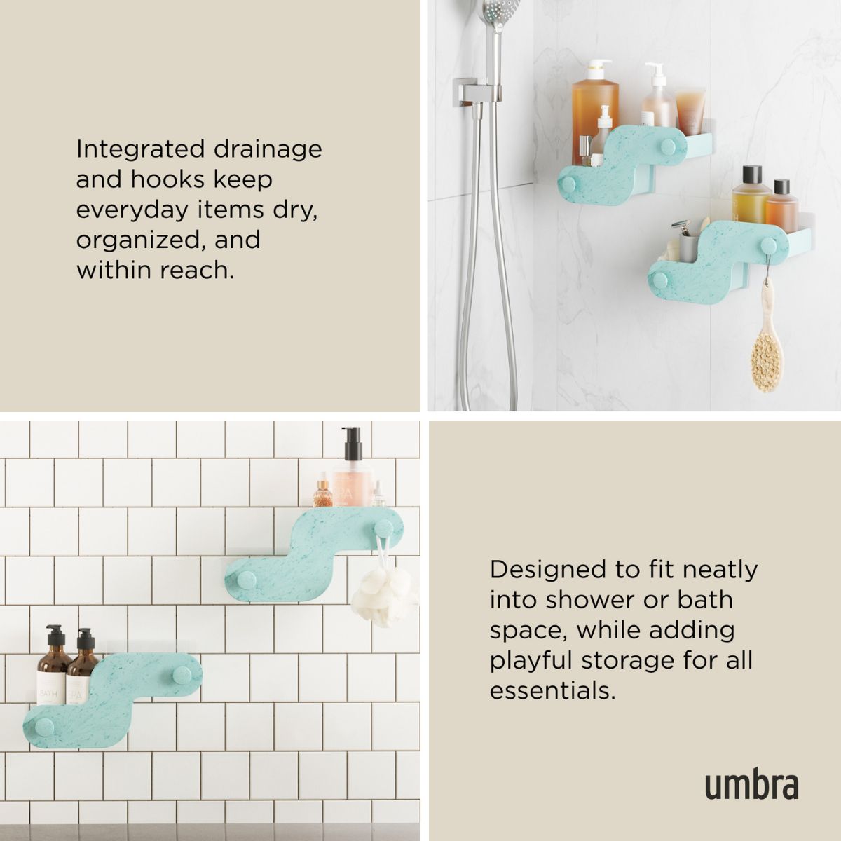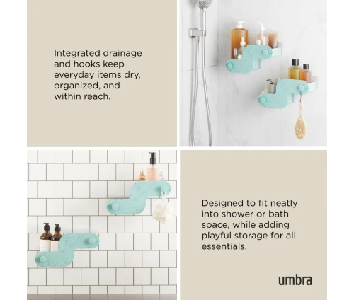 - Έξυπνος Σχεδιασμός: Κάθε θήκη διαθέτει ενσωματωμένες οπές αποστράγγισης για να παραμένουν τα αντικείμενα στεγνά, καθώς και άγκιστρα για κρέμασμα σφουγγαριών ή ξυραφιών.
